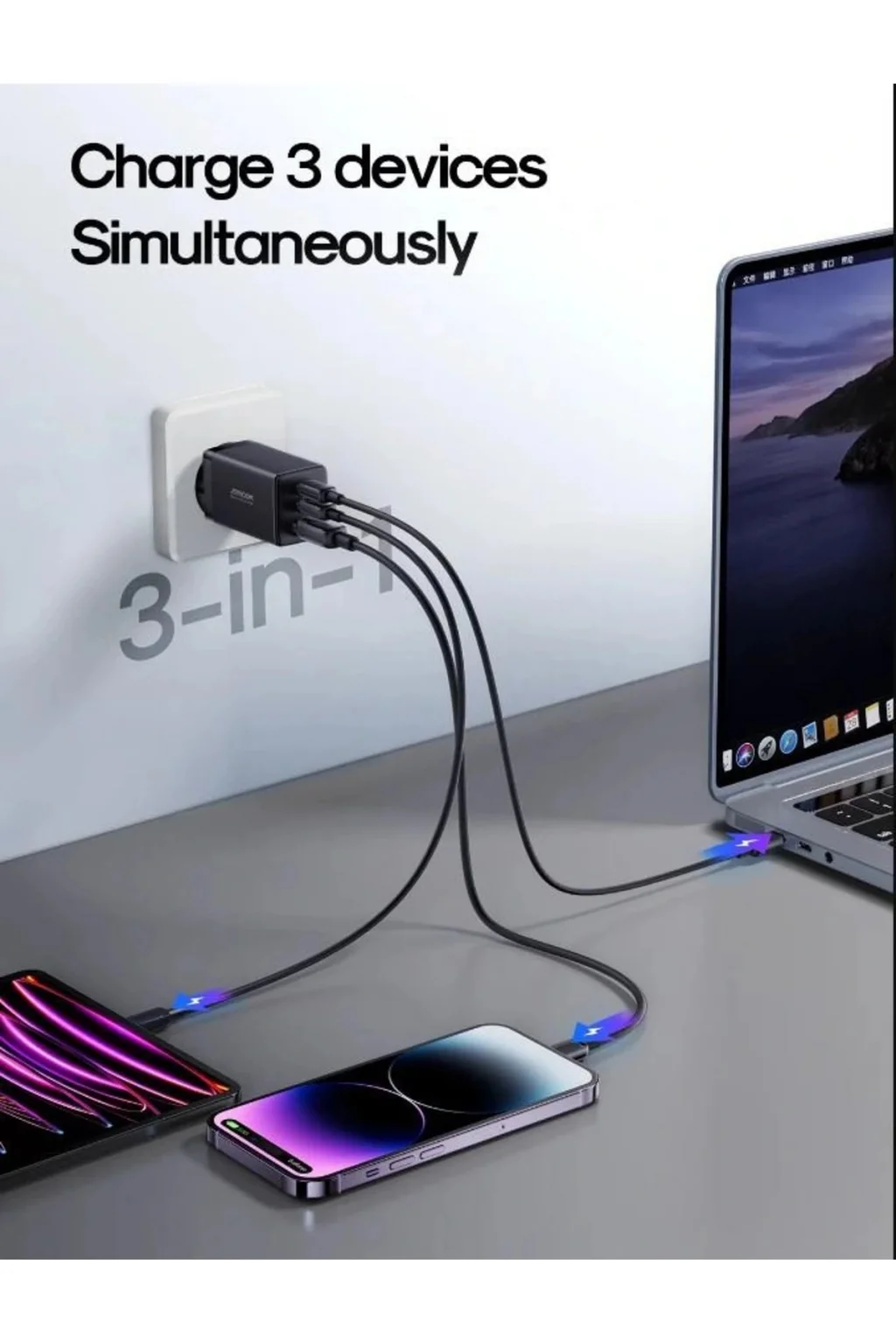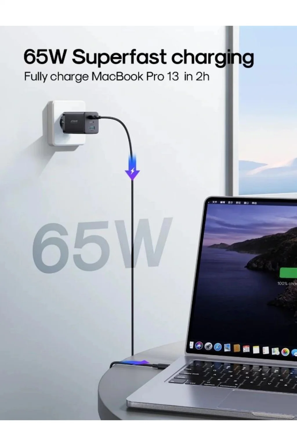 65 W yüksek güçlü çıkışlı şarj cihazı. Aynı anda üç cihaz için hızlı şarj sağlamak için üç bağlantı noktasına sahiptir. Çeşitli dizüstü bilgisayarlar, tabletler ve telefonlar ile uyumludur. PD3.0, PPS, QC3.0, Samsung AFC ve Huawei FCP/SCP süper hızlı şarj protokolleri desteklenir. Küçük boyutu ve katlanabilir fişi, taşımayı çok kolaylaştırır. En gelişmiş yüksek derecede entegre yarı iletken malzeme olan GaN çipini benimser ve daha az ısı ile kararlı şarj sağlar. CCC/CE/FCC/RoHS sertifikaları, güvenliği şarj etmeyi garanti etmek için geçer.