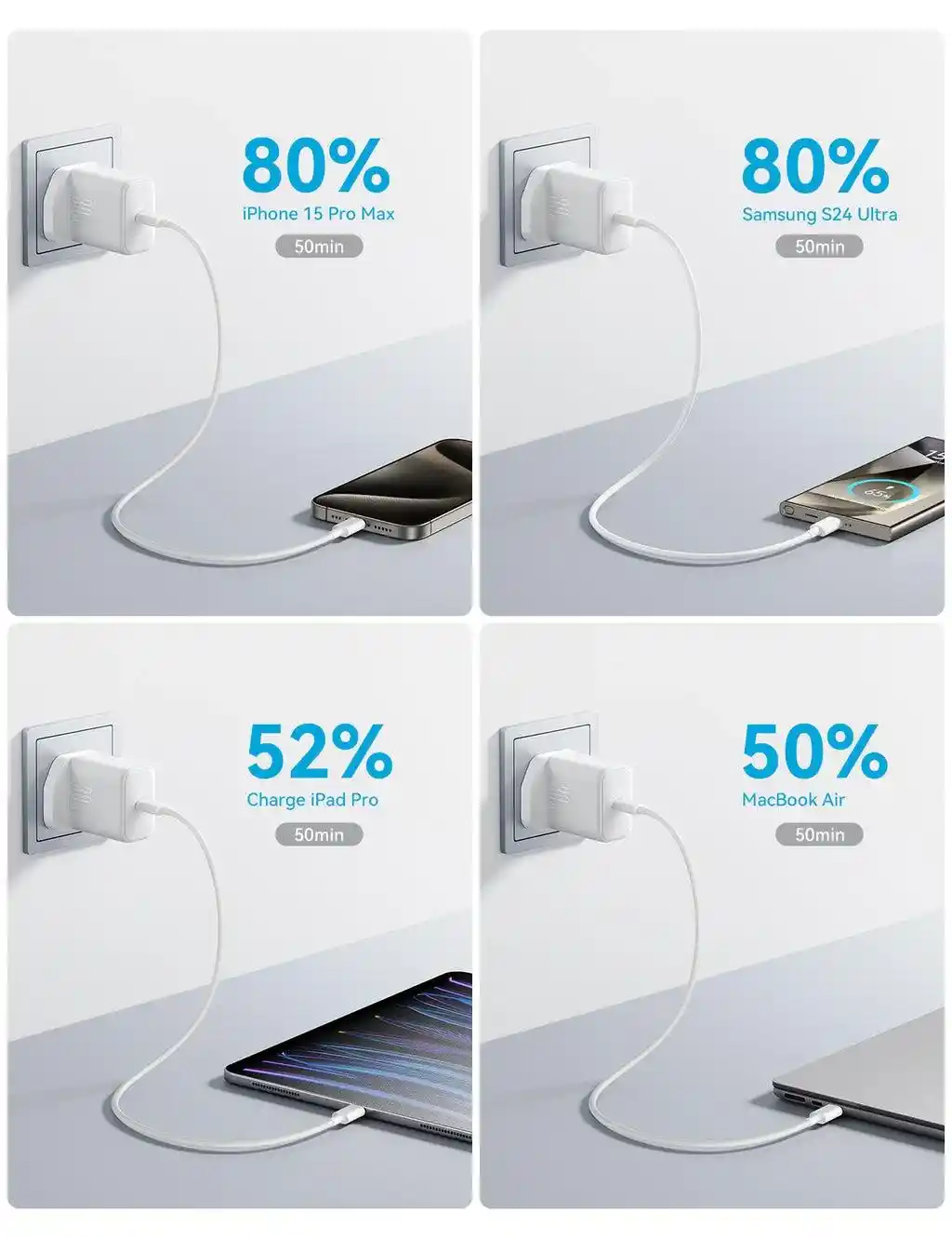 Tam Koruma En gelişmiş yüksek entegre yarı iletken malzemeyi benimser, MacBook Air için tam hızlı şarj sağlar, 1 saatte %52'ye kadar şarj olur.